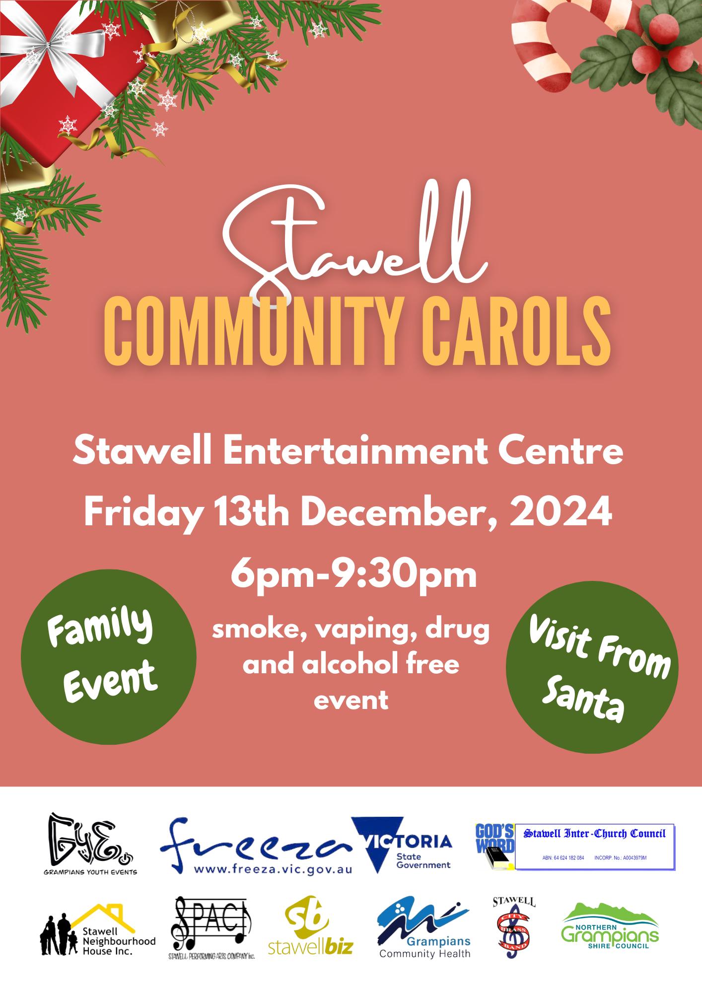Join the Christmas festivities at Stawell Entertainment Centre on Friday, December 13 at the Stawell Community Carols starting from 6pm. It's a free event and everyone is welcome to attend. We'll see you there! Please note, this is a smoke, vaping, drug and alcohol-free event.