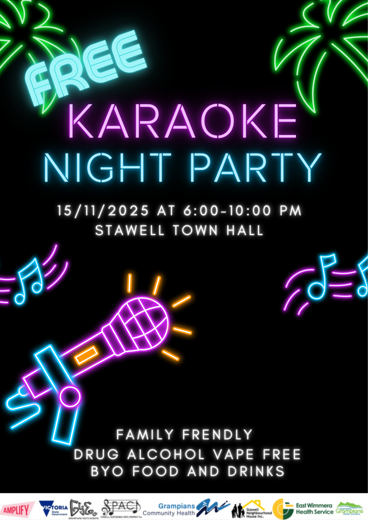 Karaoke Night Party at Stawell Town Hall - all are welcome! This is a family friendly, drug, alcohol and vape free event. BYO food and drinks.