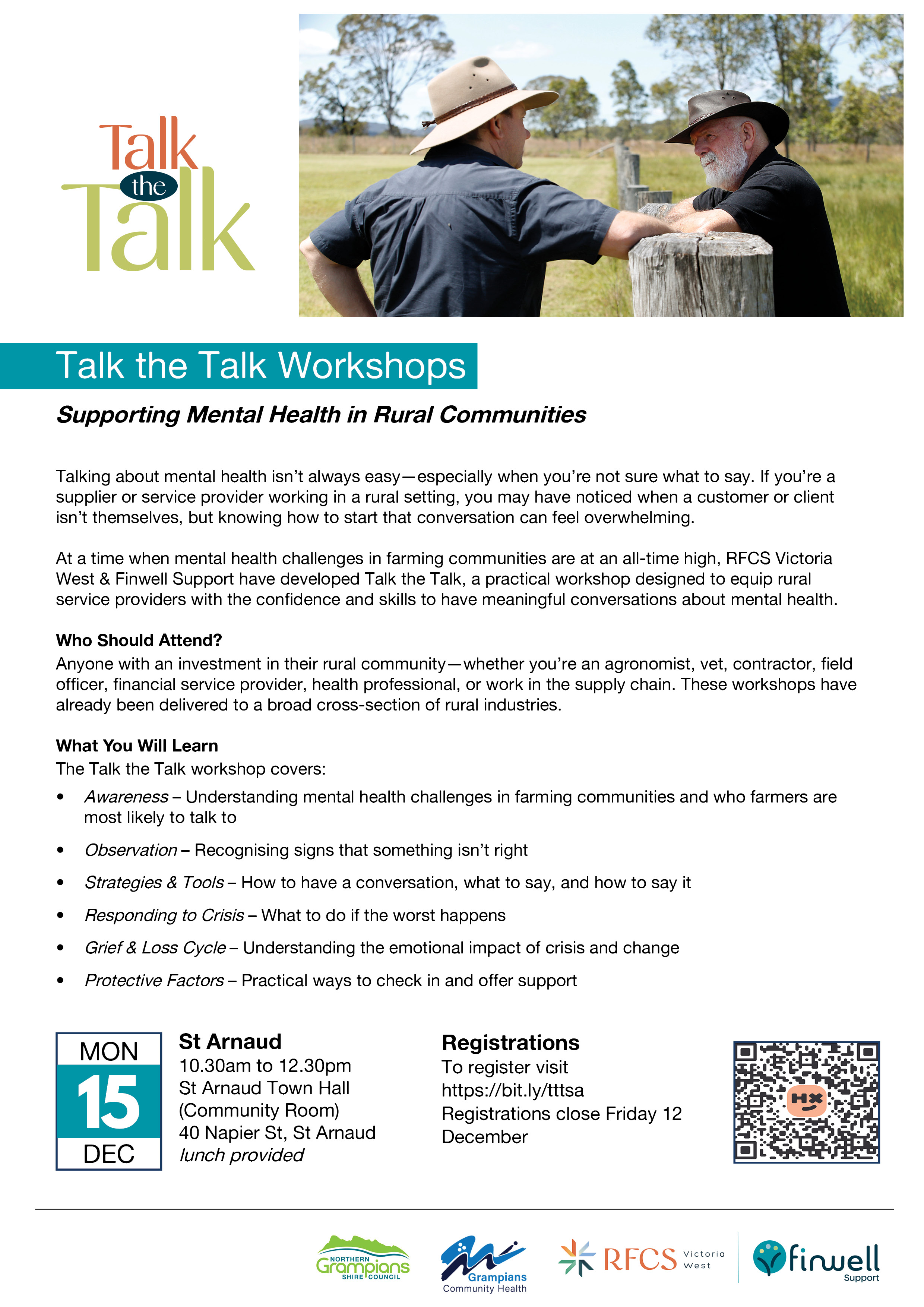 At a time when mental health challenges in farming communities are at an all-time high, RFCS Victoria West & Finwell Support have developed Talk the Talk, a practical workshop designed to equip rural service providers with the confidence and skills to have meaningful conversations about mental health.