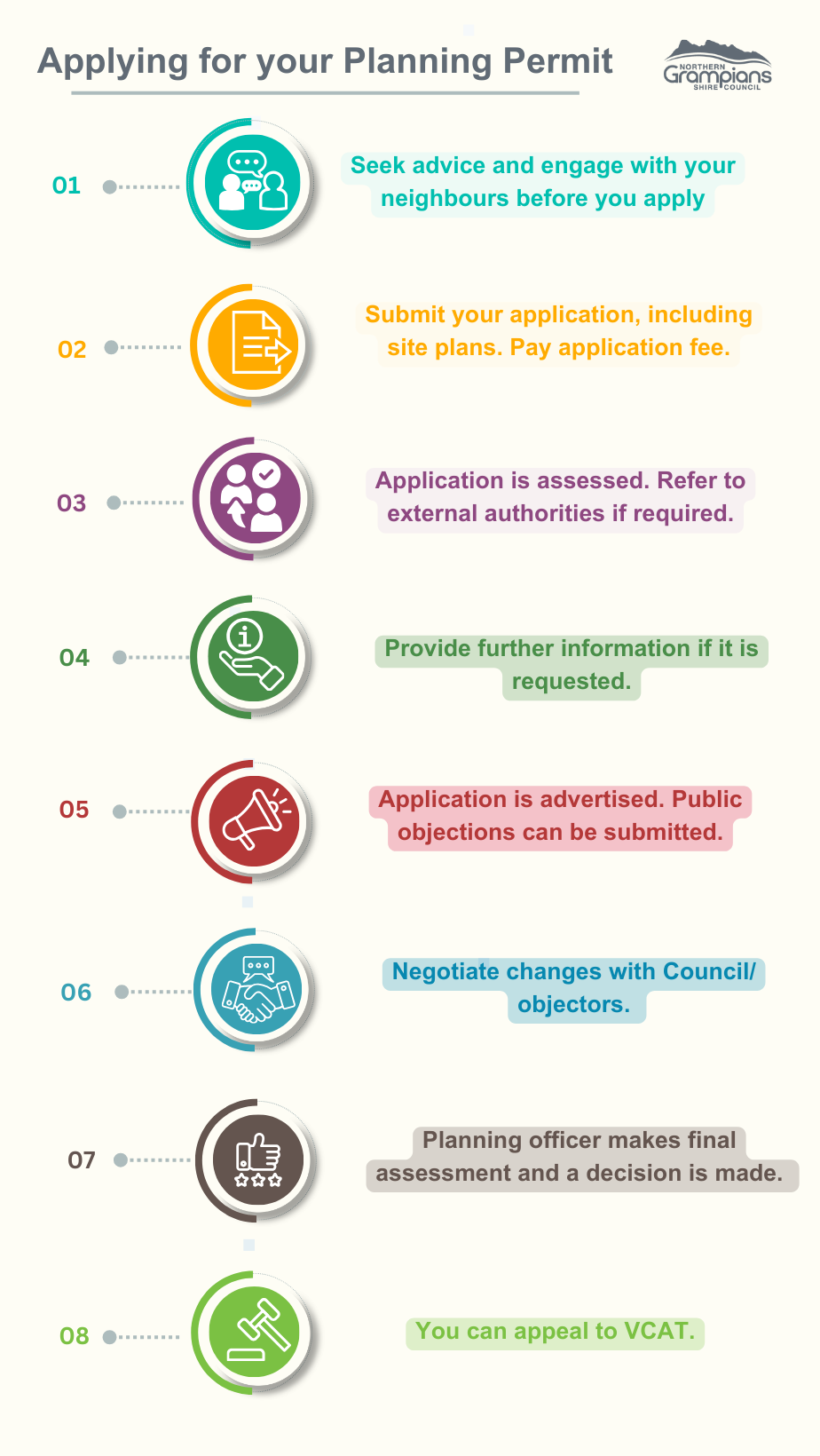 There are several steps that you will need to follow when applying for a planning permit, from pre-application to planning decision. Not all applications require every step.