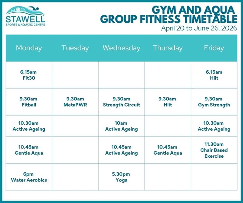 Stawell Sports and Aquatic Centre runs an extensive Group Fitness Timetable with unlimited access to our Bronze - Group Fitness, Silver - Gym/Group Fitness, Silver Group Fitness/Aquatic and Gold Members.